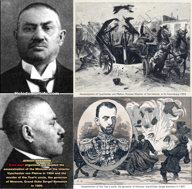 1904-Evno Azef: organized and headed the assassination of the Minister of the Interior Vyacheslav von Plehve. Born as Evno Fishelevich Azef to a Jewish family in Lyskava (now Brest Voblast, Belarus) in 1869, he joined the (Jewish) Combat Organization in 1902 and became its head in 1903. Azef worked tirelessly as a Jewish terrorist including organizing the assassination of Minister Plehve. - https://holodomorinfo.com/glossery/jewish-assassins/evno-azef/