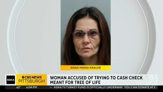 A woman was arrested after police said she tried to cash a $6,000 check intended to be a donation to the Tree of Life synagogue.